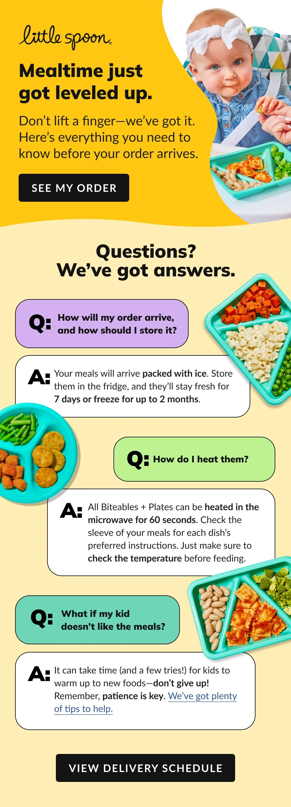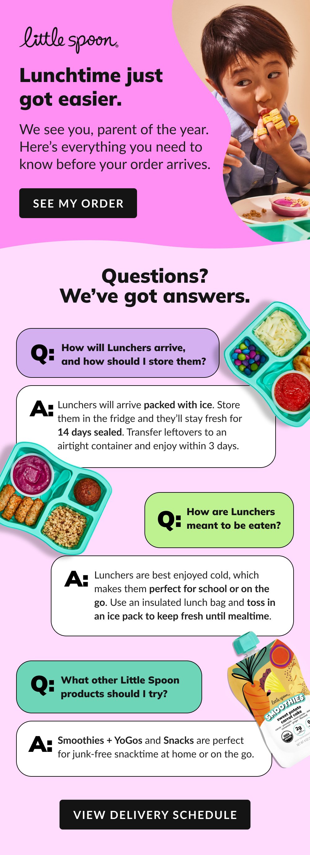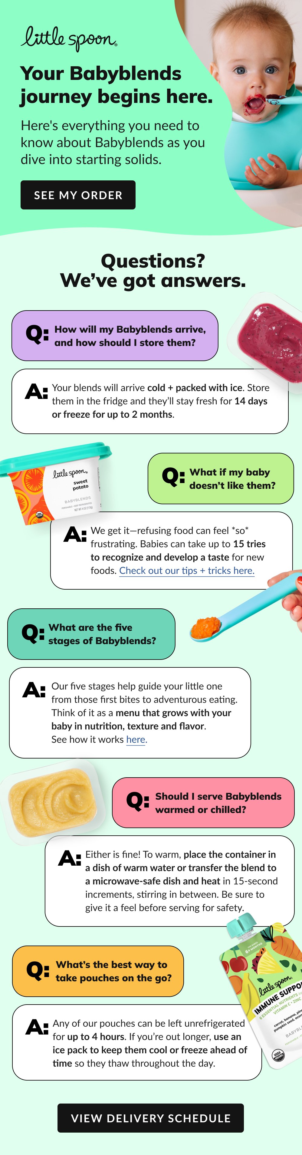 I designed a set of welcome emails for Little Spoon’s varying customer audiences, tailored by food categories. The series was structured around a question-and-answer format, addressing common questions parents are likely to have after subscribing.