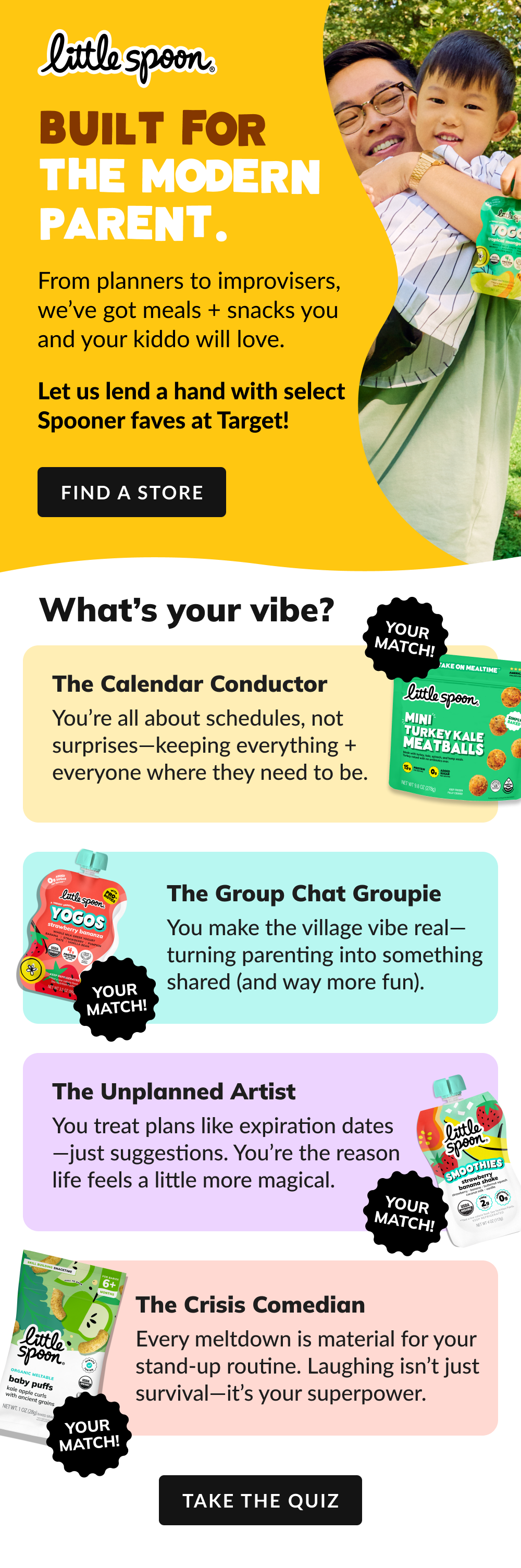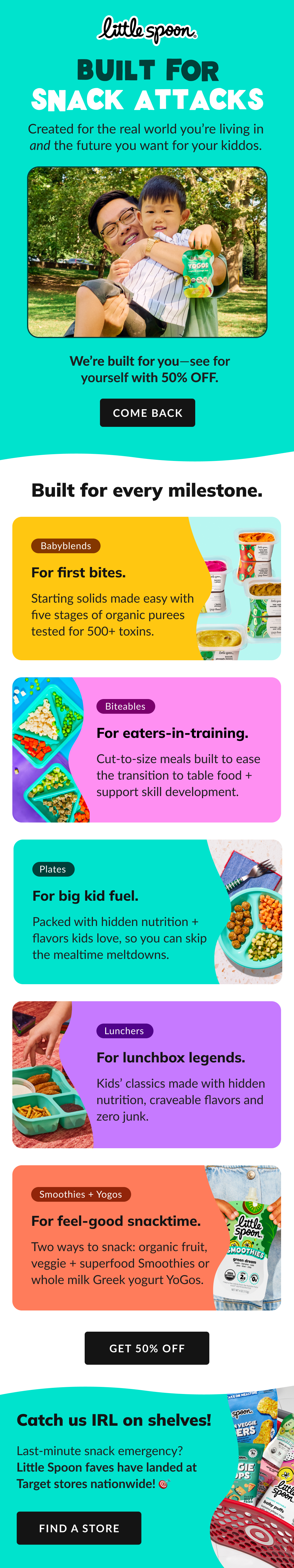I designed emails supporting Little Spoon’s major retail launch into Target, marking the brand’s expansion into stores nationwide in September 2025. The launch was accompanied by the “Built For This” campaign, a concept rooted in the idea that Little Spoon products are designed to support the real, everyday lifestyles of parents and kids. The emails played a key role in building excitement and awareness around the launch.