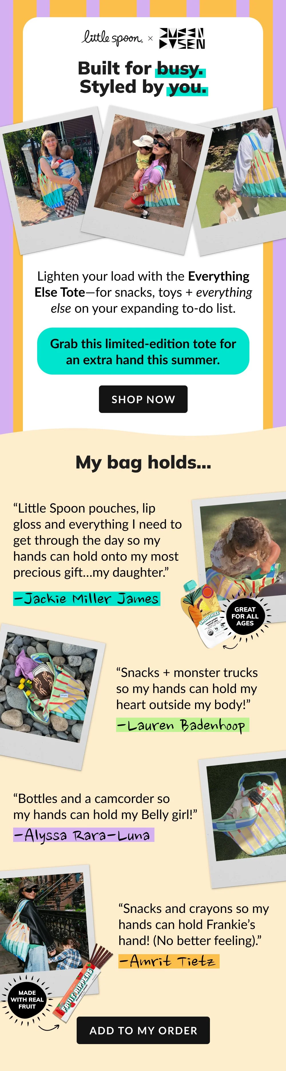 For this collabroation, I designed a series of email assets supporting the launch of a limited-edition tote bag. The campaign centered around a playful, lifestyle-driven concept highlighting what different parents “had in their bags,” brought to life through real influencer moms sharing their everyday essentials.