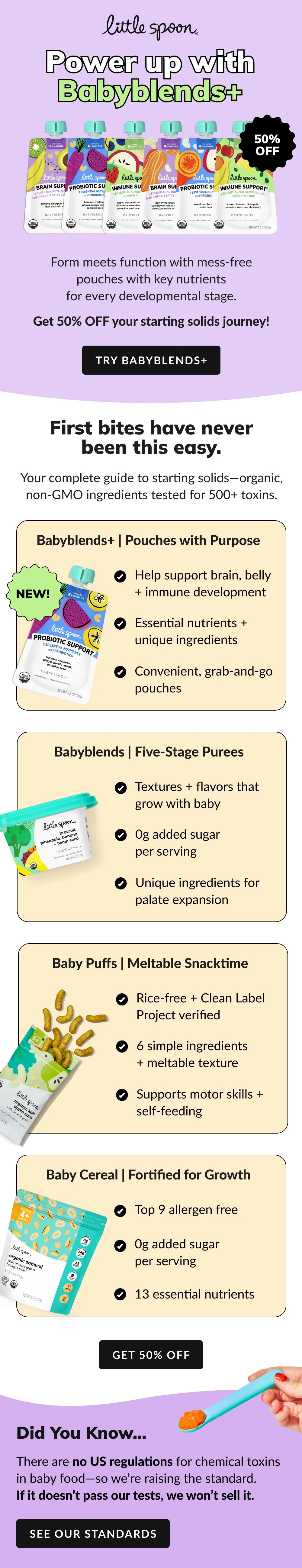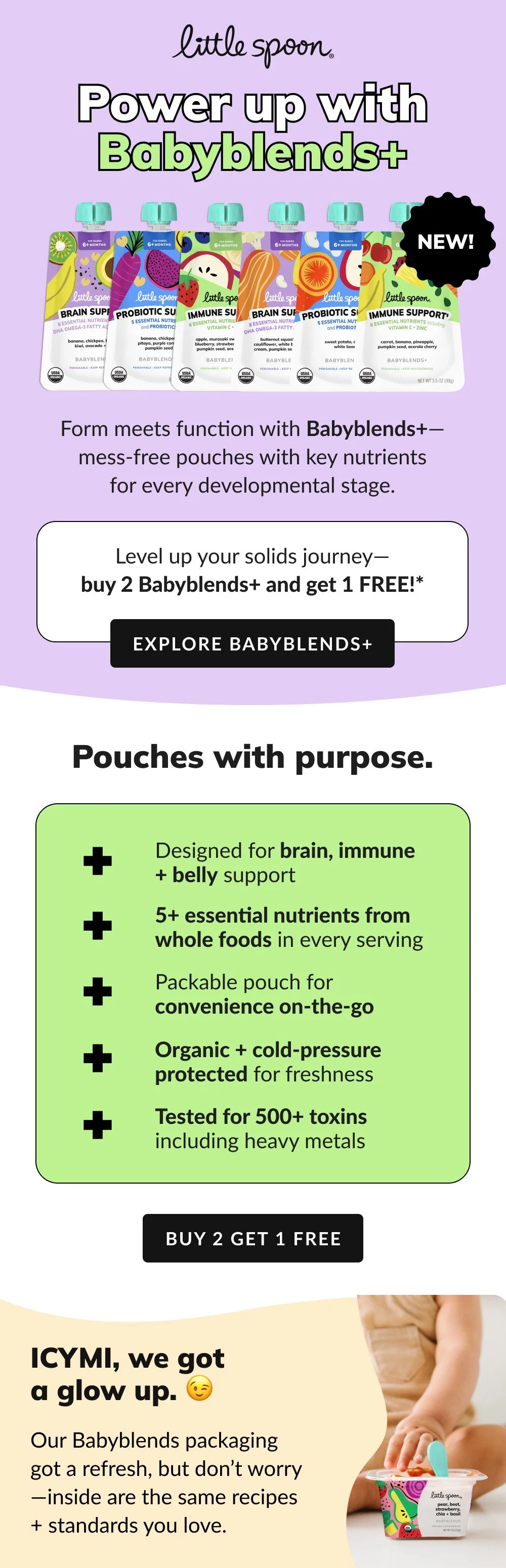 I designed emails to support the launch of Little Spoon’s Babyblends+, a new product line formulated to support immune health, brain development, and digestive balance.